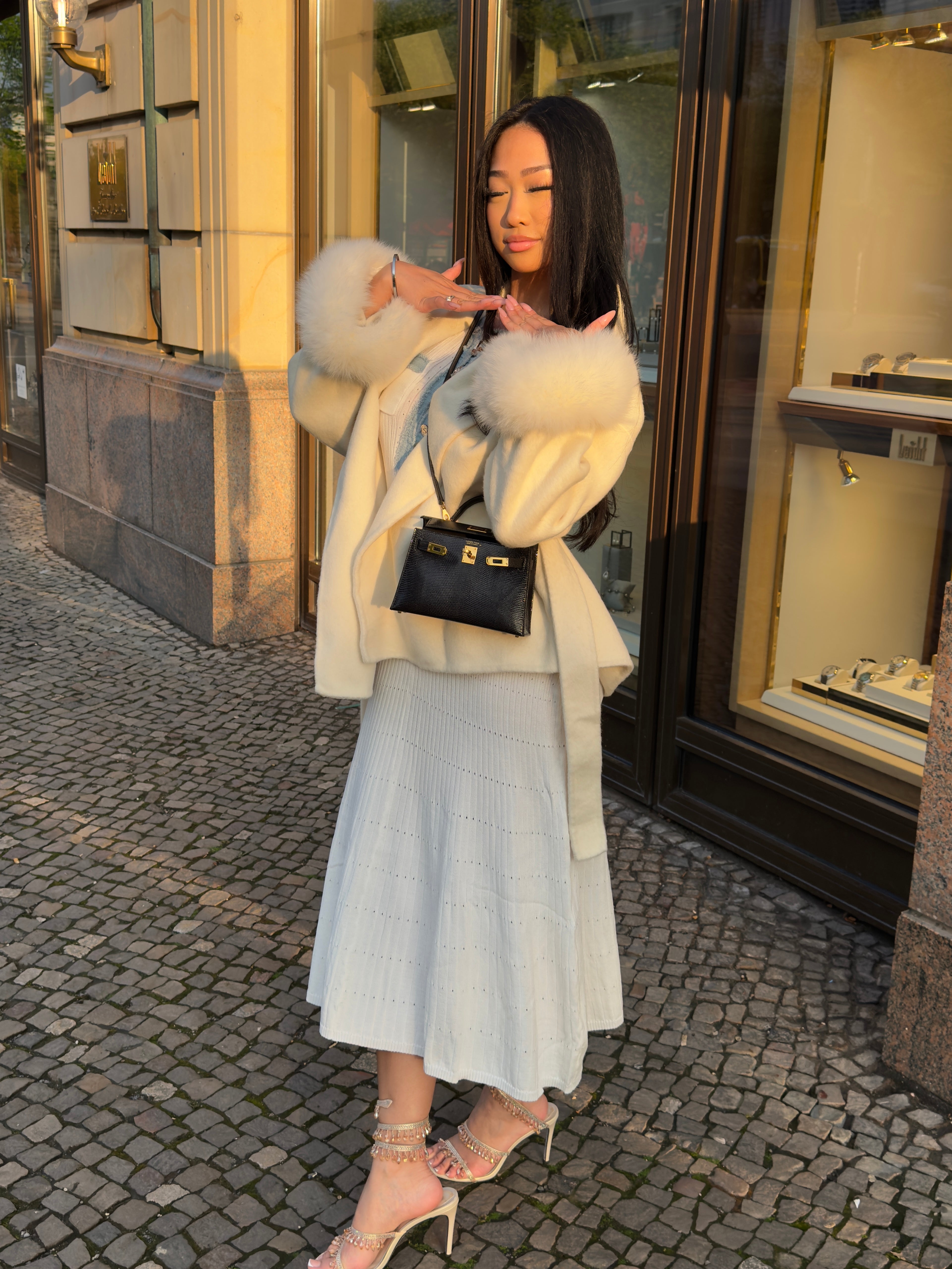 Der Mantel ist mit abnehmbaren Pelzmanschetten veredelt – für wandelbare Eleganz ganz nach Wunsch. Ob mit oder ohne Manschetten: Der Stil bleibt unverkennbar Calianté.